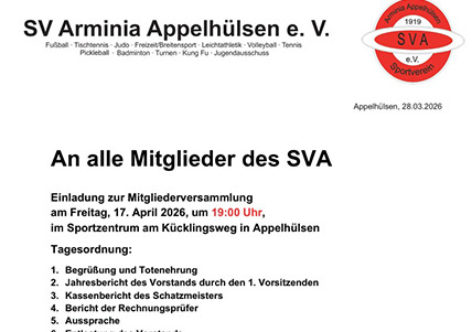 Der SV Arminia Appelhülsen e.V. ist nicht nur ein Mehrspartensportverein mit über 1.000 Mitgliedern. Vielmehr ist der SVA eine Familie, ein Treffpunkt, ein Ort der Förderung und eine Bühne des Erfolgs!